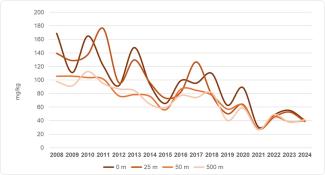 Mean barium concentration values in marine sediments between 0 and 50 m from platforms (Figure 1) show an overall decrease in 2008–2015; they remain stable until 2020, then rise in 2021 and stabilise over the following three-year period. A similar pattern, but with markedly lower values, is observed for sediments located farther from the platform.