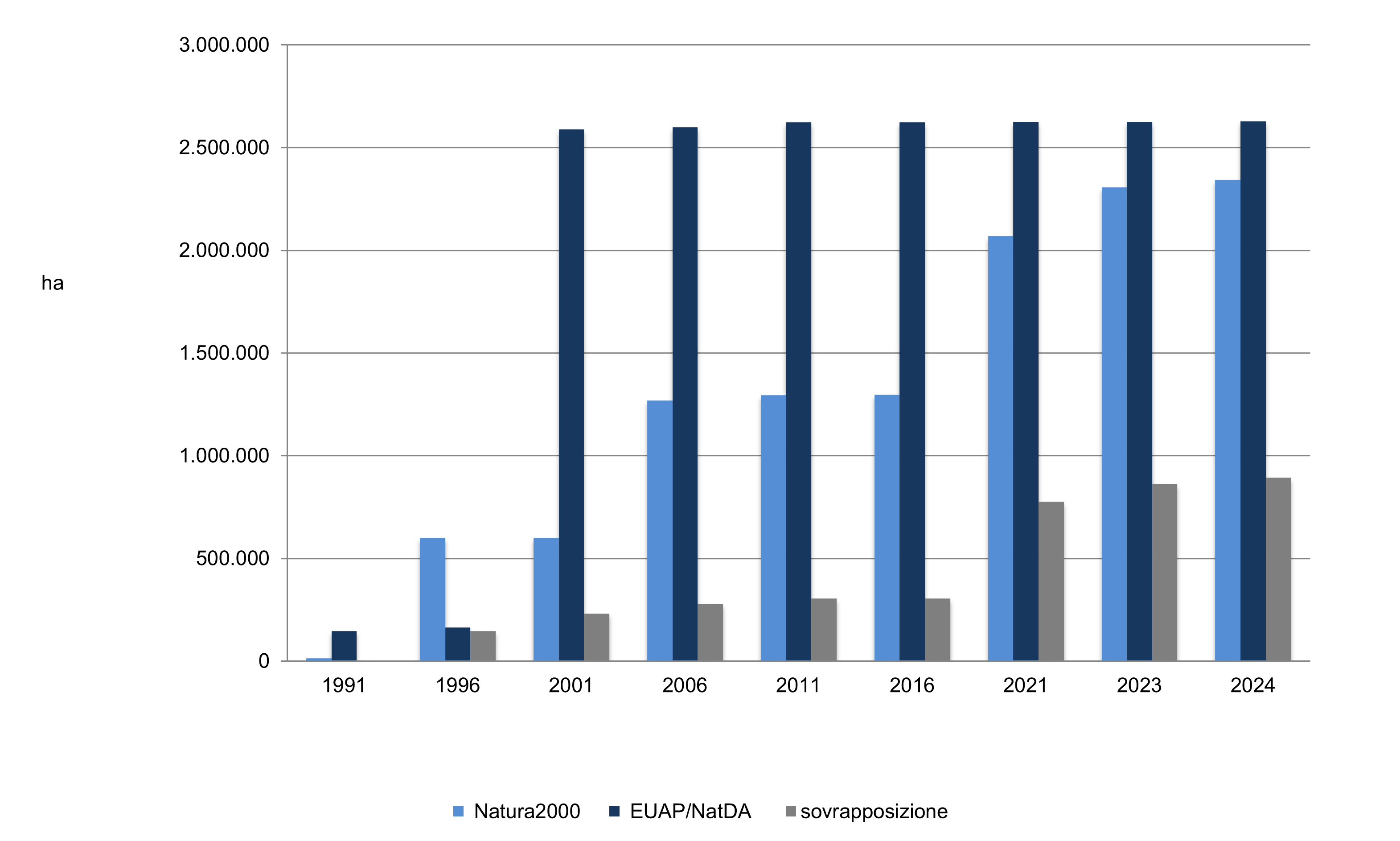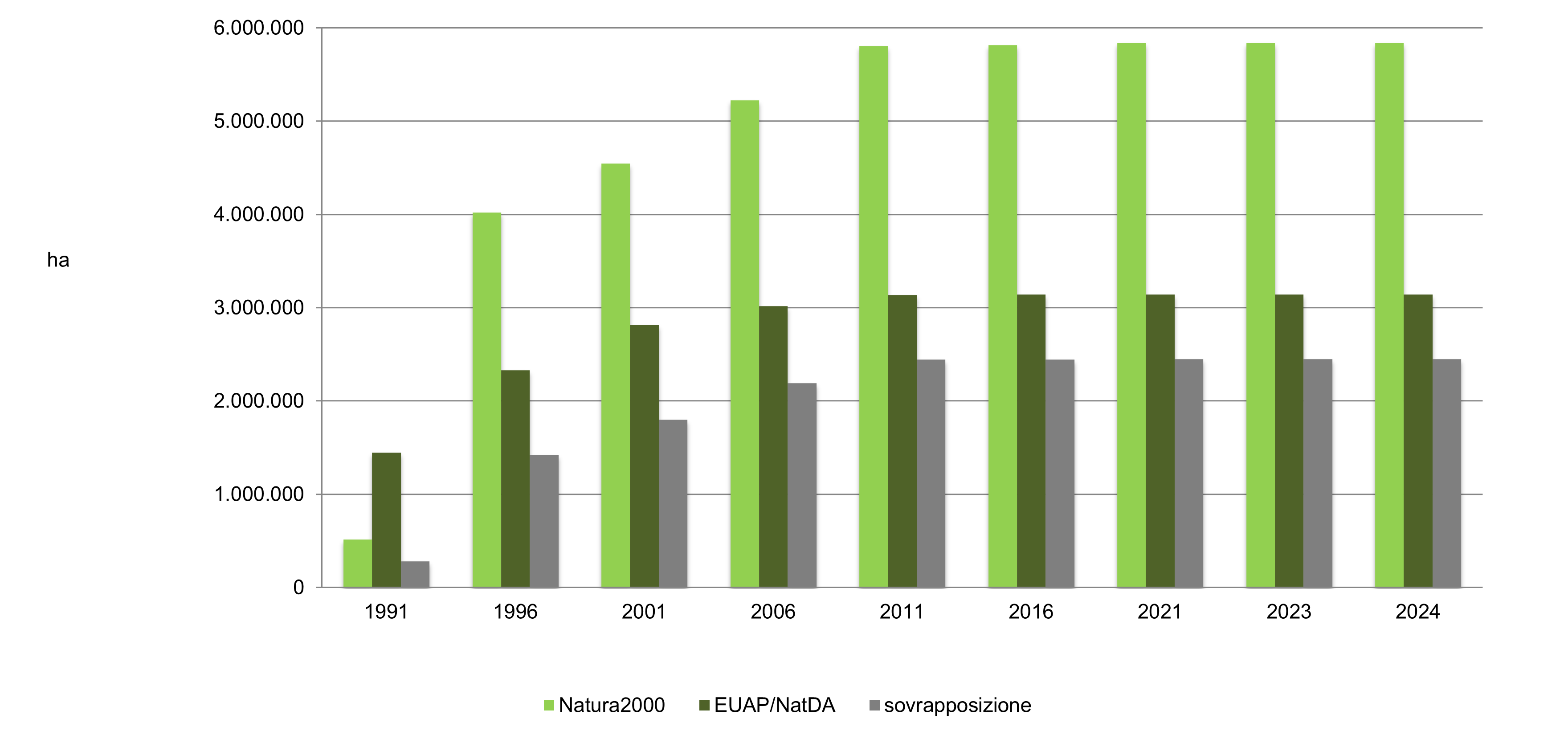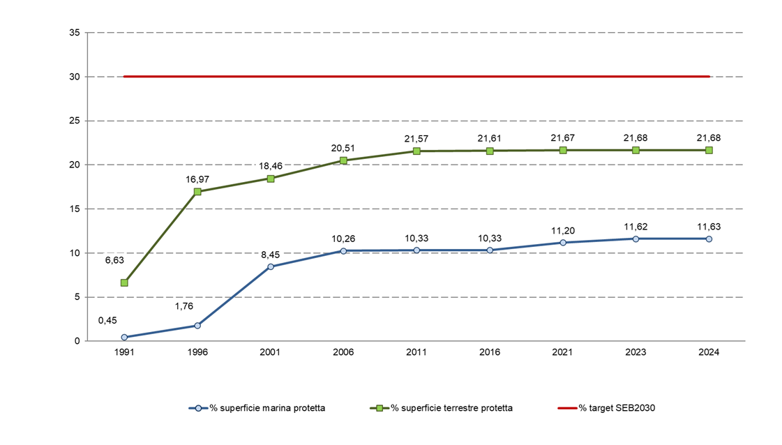 Current analyses show that national protected coverage, net of overlaps between protected areas and Natura 2000 sites, amounts to approximately 4,071,482 hectares at sea (11.63% of Italian territorial waters and the EPZ) and 6,532,887 hectares on land (21.68% of national territory), still far from the 30% EBS target. The extent of overlapping areas has progressively increased over time, reaching 893,839 hectares at sea and 2,447,065 hectares on land in 2024.