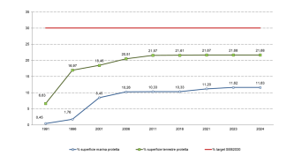 To quantify the percentage of land and marine surface covered by protected areas, net of spatial overlaps between protected areas (NatDA) and Natura 2000 sites, and to assess its temporal variation, also in order to highlight the gap with respect to the 30% target of protected surface (relative to national territory) established by the EBS 2030.