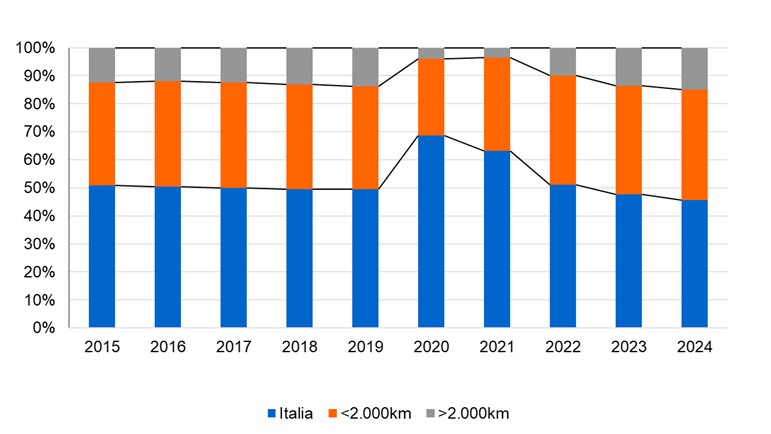 In 2024, total attendance in Italy reaches 466.2 million, marking an increase compared to 2023. Tourists from foreign countries amount to approximately 253.9 million, of which 184.9 million come from distances less than 2,000 km, and 69.1 million from greater distances. The share of tourists from distant countries thus stands at 14.8% of the total (Table 1, Figure 2).