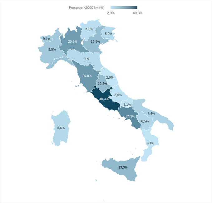 Regions such as Lazio (40.3%), Campania (24.2%), Lombardy (20.3%) and Tuscany (20.9%) confirm their role as attractive poles for intercontinental tourism (Figure 3). This leads to a territorial concentration of environmental impacts, with greater pressure on urban areas and transport infrastructures. Structural dependence on distant markets is a factor of both environmental and climate vulnerability. To reduce this pressure, it is necessary to encourage domestic and European short and medium-haul tourism, promoting sustainable forms of mobility, in particular rail transport for intra-European routes.