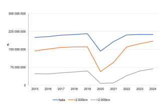 The data confirm a progressive normalization of international tourist flows, with a share of presences from distant countries that realigns with the pre-COVID period. In 2024, foreign presences reach about 253.9 million, with 69.1 million from countries over 2,000 km away.