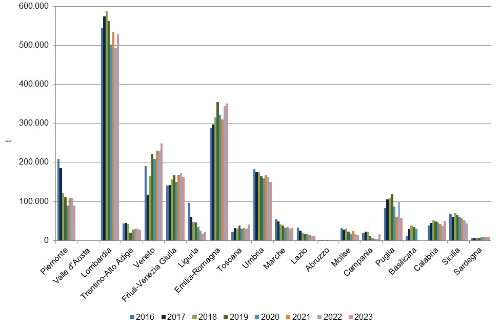 Conversely, a decrease in the quantities recovered for energy purposes was observed in Piedmont (over -19 thousand tonnes, -17.8%), Umbria (-13 thousand tonnes, -8.1%), Molise (over -3 thousand tonnes, -20.5%), Sicily (over -7 thousand tonnes, -14.2%), Trentino-Alto Adige (over -3 thousand tonnes, -11%), Apulia (over -42 thousand tonnes, -42.4%), and Lazio (over -1 thousand tonnes, -11.2%). Data for Sardinia and Abruzzo remained essentially stable, showing slight decreases of about -400 and -250 tonnes, respectively (Figure 1).