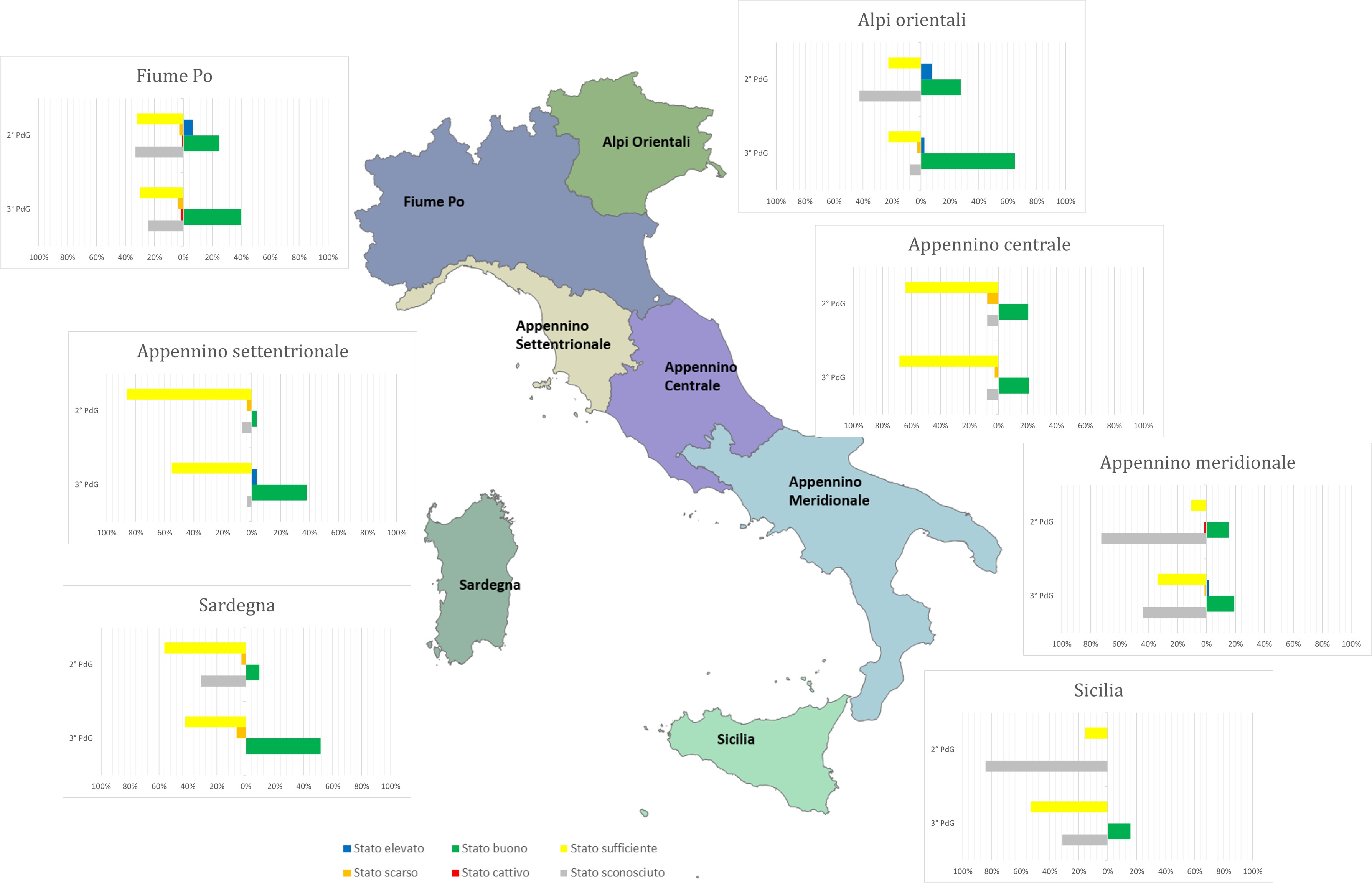L’analisi delle acque superficiali interne a livello nazionale mostra che i corpi idrici in stato ecologico buono ed elevato sono pari al 43%. Il Distretto della Sardegna presenta una percentuale di corpi idrici che raggiunge l’obiettivo di qualità ecologica pari al 75%. I Distretti della Sicilia e dell’Appennino Meridionale hanno ancora un elevato numero di corpi idrici in stato sconosciuto, rispettivamente il 44% e il 33%.