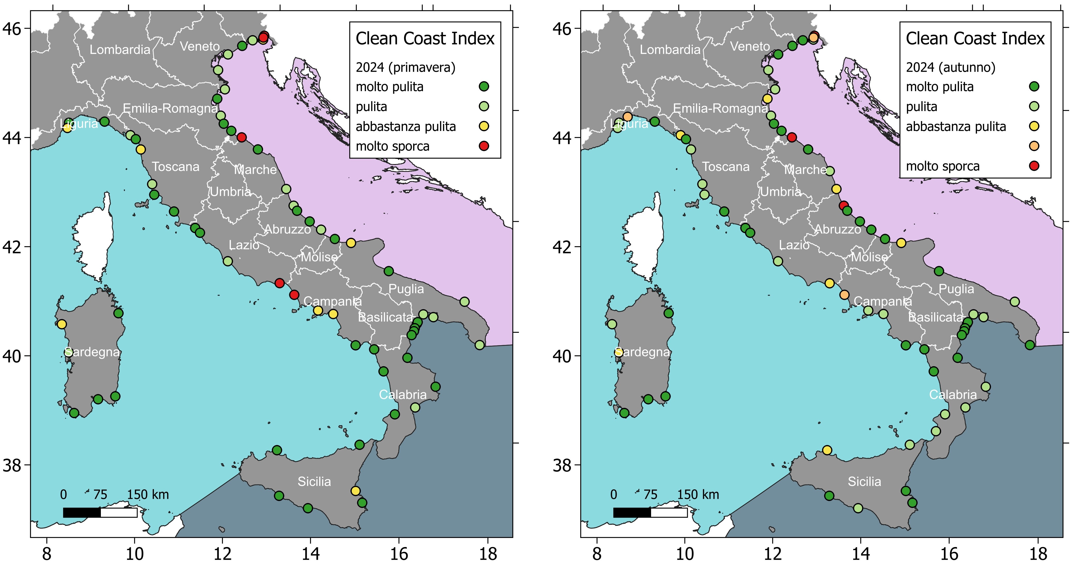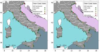 Figura 1: Mappa delle spiagge monitorate in primavera e autunno classificate in base al Clean Coast Index