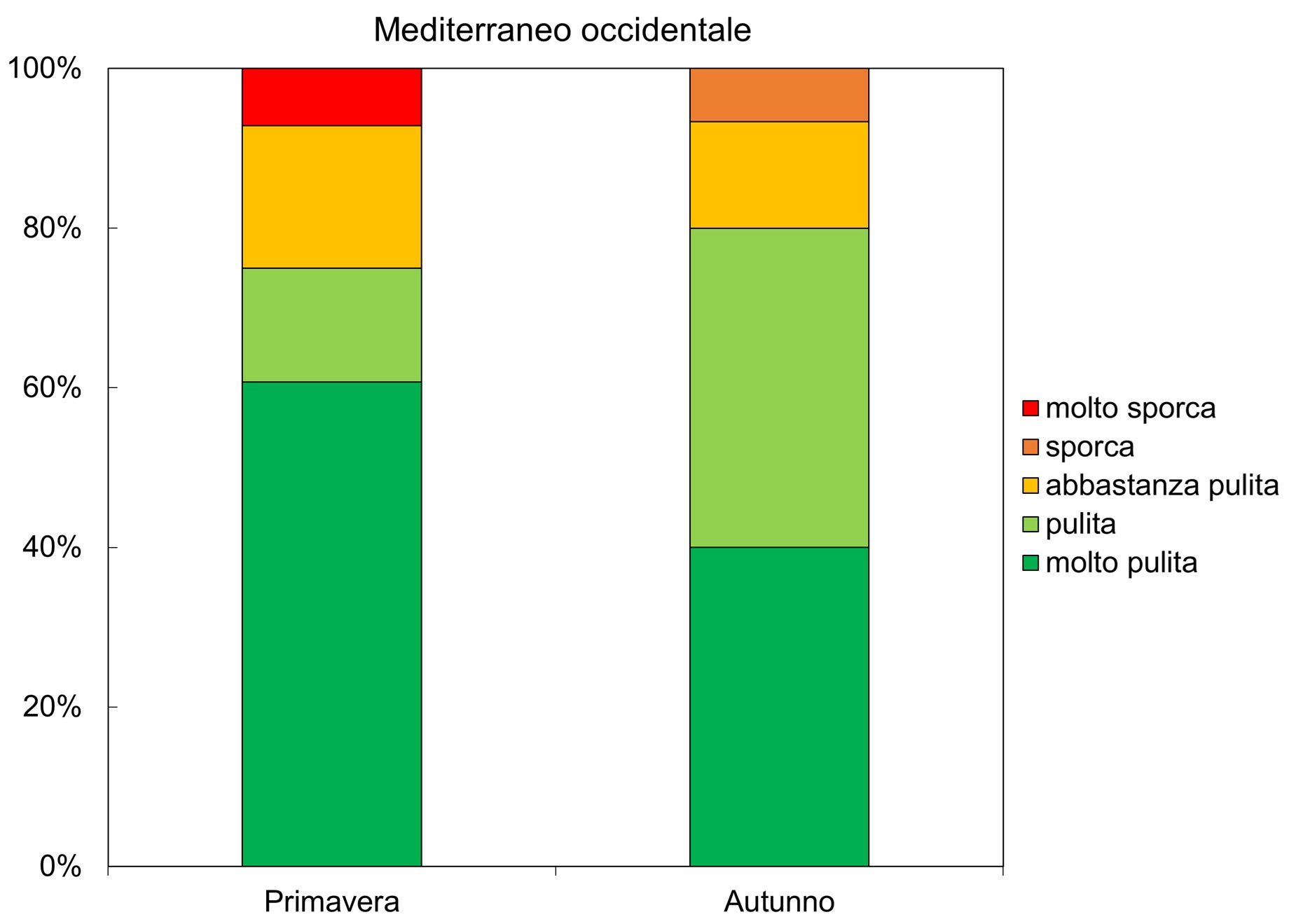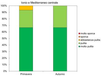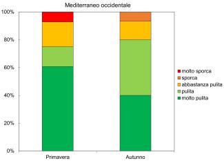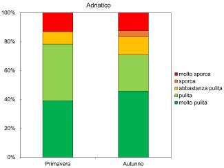 A livello nazionale (Figura 1), circa la metà delle spiagge monitorate sono risultate molto pulite (55% in primavera e 48% in autunno) o pulite (26% in primavera e 33% in autunno), mentre la percentuale di spiagge sporche o molto sporche è bassa in entrambe le stagioni (attorno all’8%). Nella sottoregione Ionio e Mediterraneo centrale, quasi tutte le spiagge sono risultate molto pulite o pulite in entrambe le stagioni. L’Adriatico presenta invece le percentuali più alte di spiagge sporche o molto sporche (13% in primavera e 17% in autunno), anche se oltre la metà delle spiagge risultano pulite o molto pulite (78% in primavera e 71% in autunno). Nella sottoregione del Mediterraneo occidentale solo 2 spiagge sono risultate molto sporche in primavera e nessuna in autunno, mentre le spiagge sporche sono state solo 2 in autunno e nessuna in primavera.