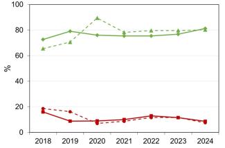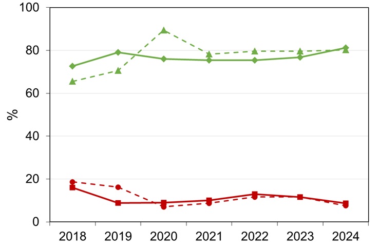 Figura 2: Percentuale di spiagge molto pulite e pulite (linee verdi) e sporche e molto sporche (linee rosse) negli anni (2018-2024)