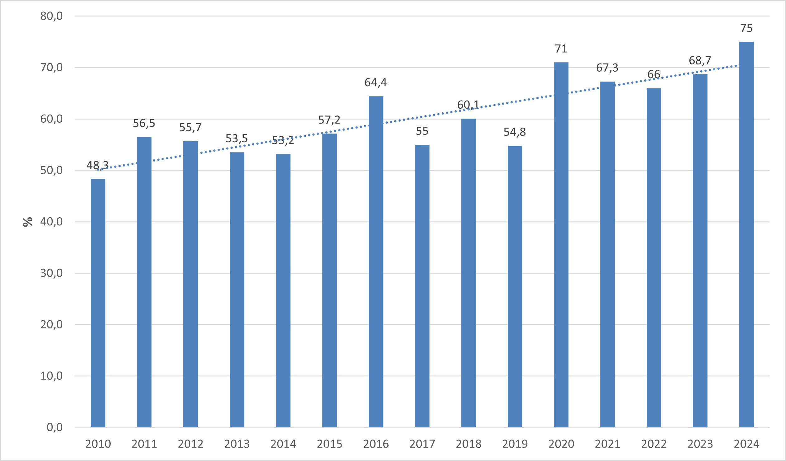 Si attribuisce un trend negativo poiché l'andamento nei 15 anni considerati non mostra una netta inversione di tendenza. Infatti, dal 2010 si rileva un incremento nel tempo, di oltre 27 punti percentuali, dei siti con presenza di Ostreopsis ovata (2010: 48,3%, 2024: 75%) (Figura 2 e Tabella 3). Si osservano, inoltre, variazioni minime del numero dei siti con presenza della microalga nel periodo 2010-2015 e maggiori tra il 2016 e il 2024. Il valore massimo, pari al 75%, si registra nel 2024.