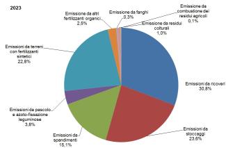 Nel 2023, la fonte emissiva più significativa è rappresentata dalla gestione degli allevamenti (emissioni dal ricovero e dallo stoccaggio), che contribuisce per il 54% al totale delle emissioni di NH3 di origine agricola. Le altre fonti emissive del settore sono (Figura 3): lo spandimento delle deiezioni animali (15,1%), l’applicazione al suolo di fertilizzanti azotati sintetici (22,8%), il pascolo e l’azoto fissato al suolo tramite il processo di azoto-fissazione prodotto dalle radici delle leguminose che contribuiscono alle emissioni della categoria definita “emissioni da terreni senza fertilizzanti” (3,8%), gli altri fertilizzanti organici (2,5%), lo spandimento dei fanghi da depurazione (0,3%), la combustione dei residui agricoli (0,1%) e le emissioni da residui colturali (1,0%).