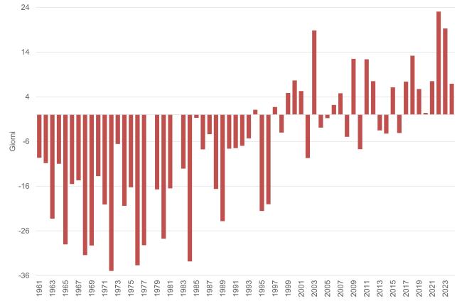 Nel 2024 è stato osservato un incremento di 6,9 giorni estivi rispetto al valore medio calcolato nel trentennio di riferimento 1991-2020.
