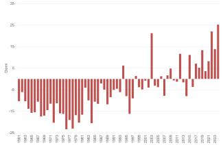 L'indicatore descrive la tendenza dei fenomeni di caldo intenso in Italia, nello specifico esprime il numero di giorni con temperatura minima dell'aria maggiore di 20°C. Nel 2024 è stato osservato un incremento di 25,2 notti tropicali rispetto al valore medio calcolato nel trentennio di riferimento (1991-2020).