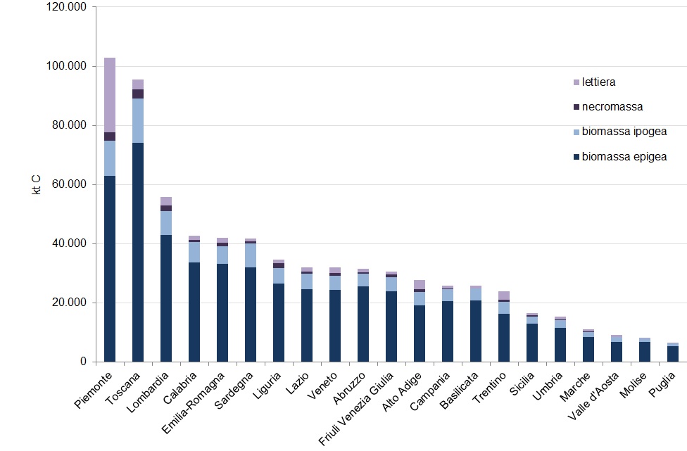 La ripartizione, a livello regionale, dello stock di carbonio (Figura 2) è fortemente correlata alla frazione di superficie coperta da foreste.