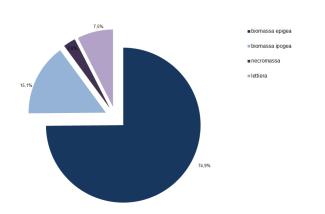 Nel 2023 la quantità di carbonio fissato nelle foreste italiane (carbon stock) è stata pari a circa 712,0 milioni di tonnellate di carbonio (MtC). Di queste, 533,0Mt C (74,9% del totale) sono stoccate nella biomassa epigea, 107,2Mt C (15,1% del totale) nella biomassa ipogea, 18,4Mt C nella necromassa (2,6% del totale) e 53,5MtC nella lettiera (7,5% del totale) (Figura 1).