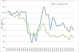 L'indicatore rappresenta l'andamento delle emissioni nazionali di composti organici persistenti per settore di provenienza, dal 1990 al 2023. L’obiettivo del conseguimento di valori di emissione inferiori a quelli del 1990, è stato conseguito sia per gli IPA (-32%) sia per diossine e furani (-44%), seppure con andamenti differenti.