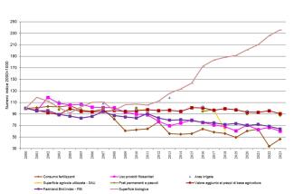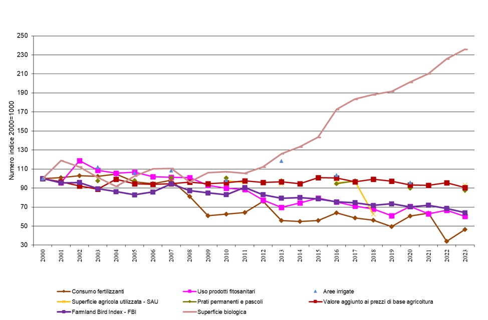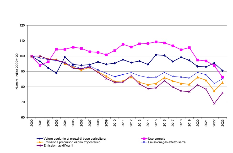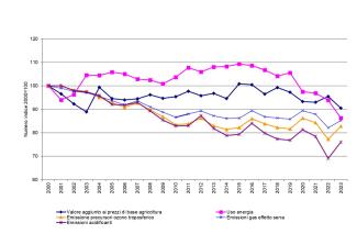 L'indicatore confronta il valore aggiunto ai prezzi di base (vale a dire la differenza tra il valore dei beni e servizi conseguiti dal settore agricolo e il valore dei beni e servizi intermedi consumati nel periodo considerato) con l'uso delle risorse, rappresentate dalla Superficie Agricola Utilizzata (SAU), dalla superficie agricola irrigata, dai prati e pascoli permanenti, dall'uso di energia, considerando anche le pressioni ambientali derivanti dalle emissioni in atmosfera e dall'uso di prodotti fitosanitari e fertilizzanti e gli impatti sulla biodiversità. L'andamento di queste grandezze tra il 2000 e il 2023 è valutato in modo indicizzato, assumendo il valore del 2000 uguale a 100.