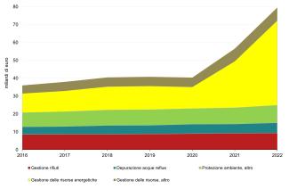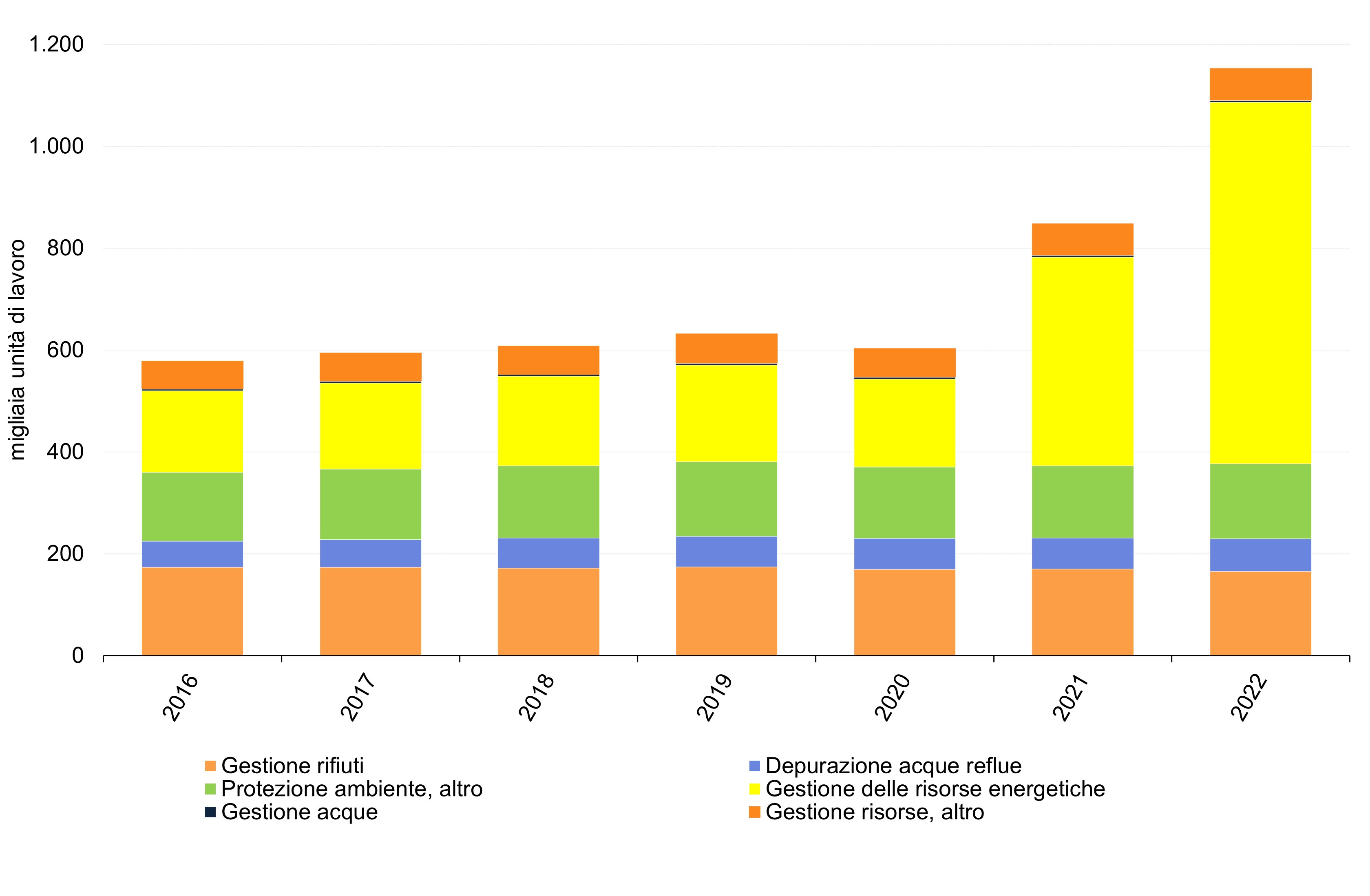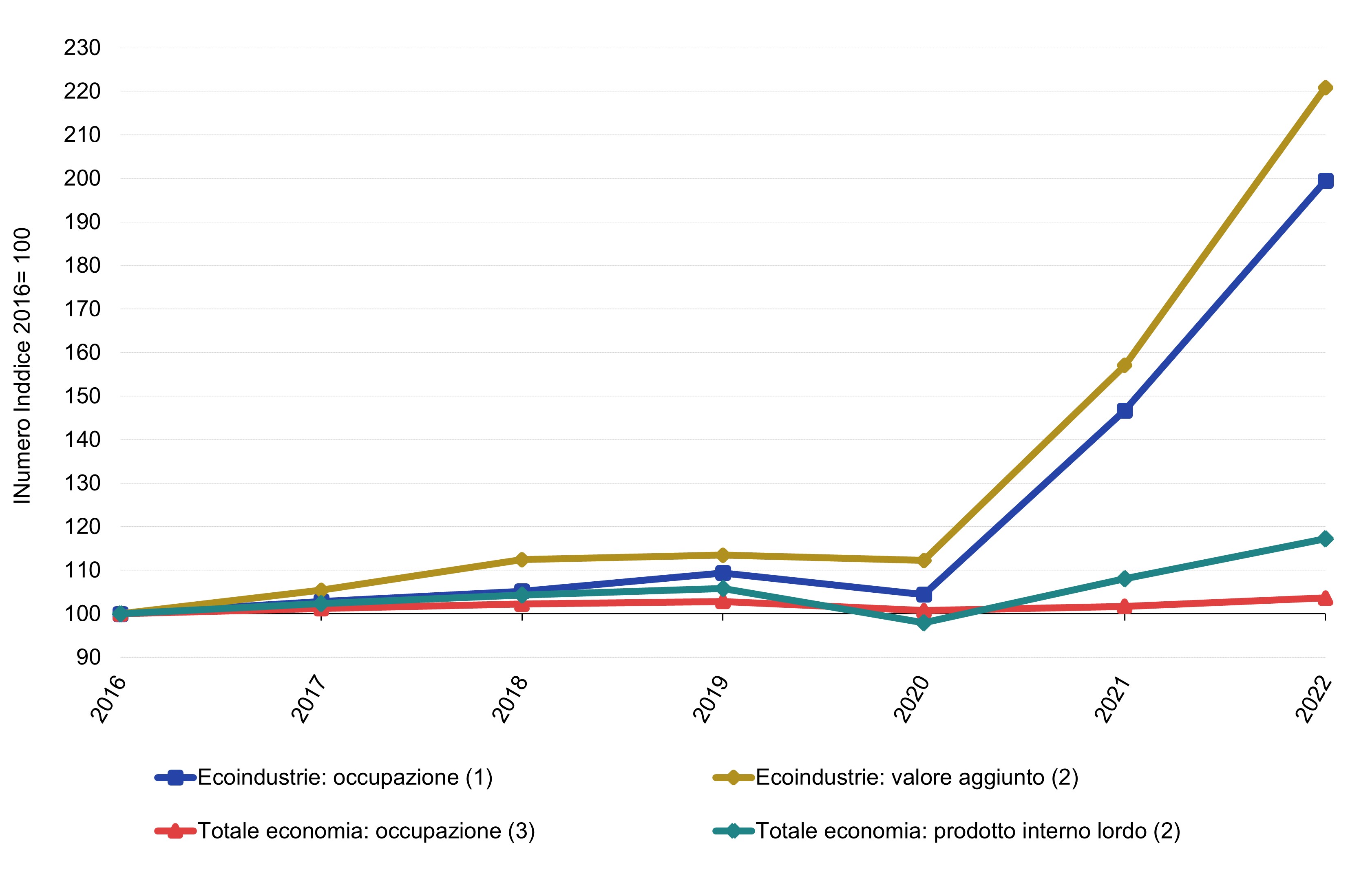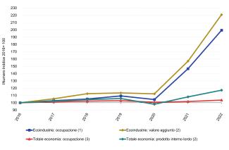 Fra il 2016 e il 2022, l'occupazione e il valore aggiunto delle ecoindustrie registrano dati in crescita (rispettivamente +99,5% e +120,9%), con un incremento considerevole negli ultimi due anni. Il settore ambientale registra una maggiore dinamicità rispetto all'economia complessiva italiana (Figura 1).