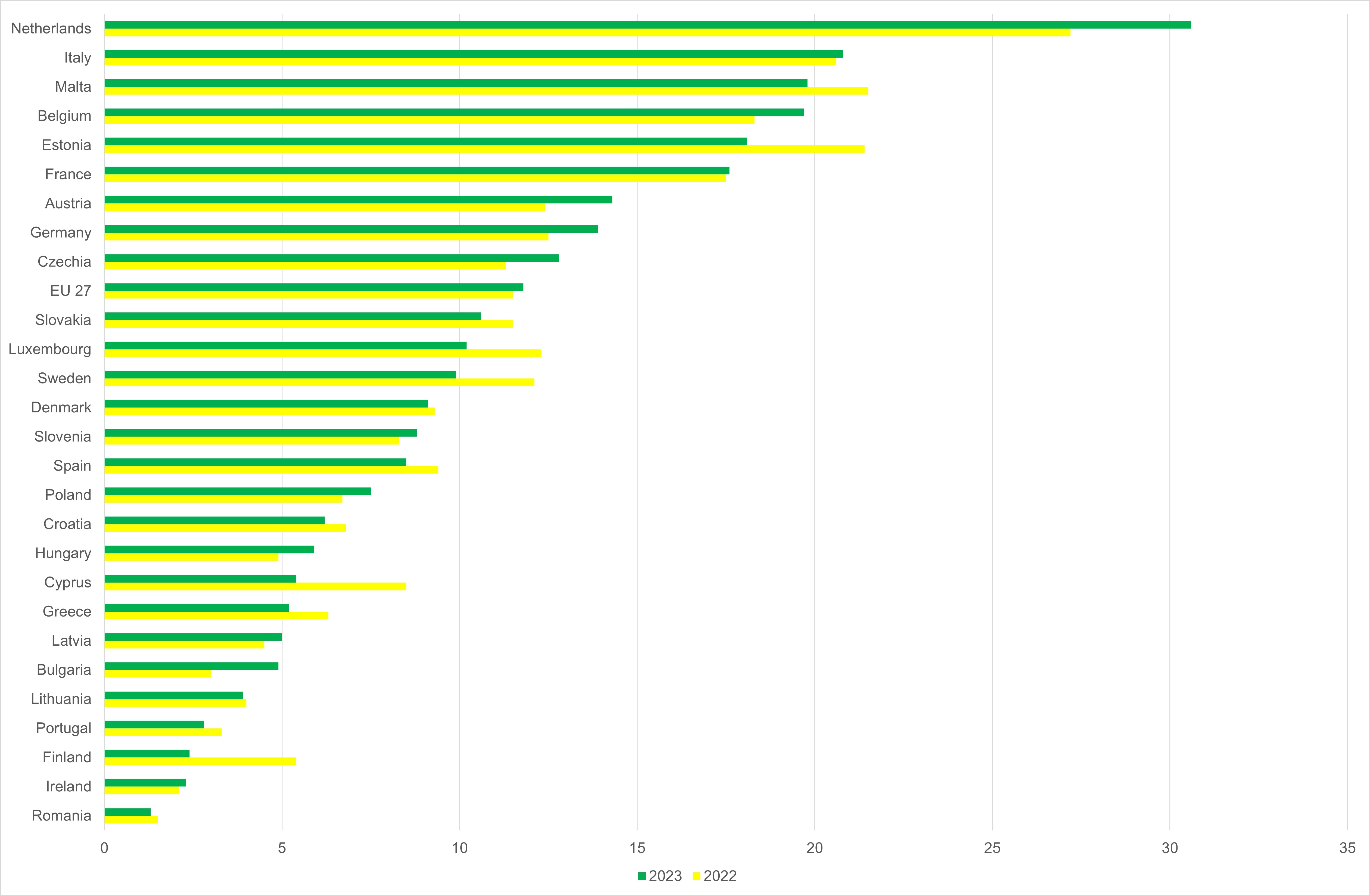Nel 2023, l'Italia ha registrato un tasso di utilizzo circolare dei materiali (circular material use rate) pari al 20,8%, posizionandosi al secondo posto tra i paesi dell'Unione Europea, subito dopo i Paesi Bassi (30,6%) e seguita da Malta (19,8%) (Figura 1). Il risultato italiano è significativamente superiore alla media dell'UE, che nel 2023 si attesta all'11,8%. Questo dato riflette l'impegno del paese nel promuovere pratiche di riciclo e riutilizzo dei materiali, contribuendo alla riduzione della dipendenza da materie prime vergini e all'avanzamento verso un'economia più sostenibile.