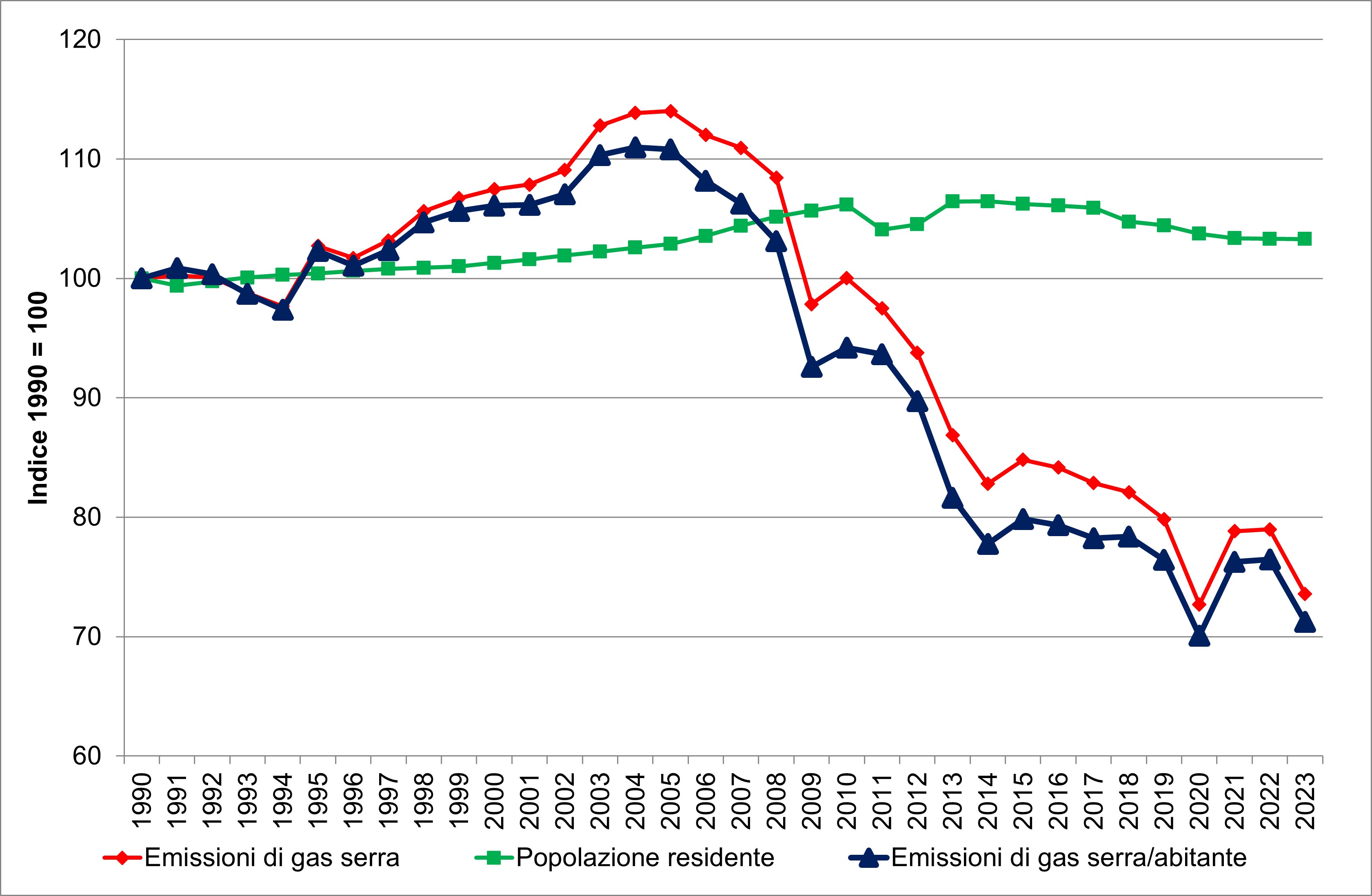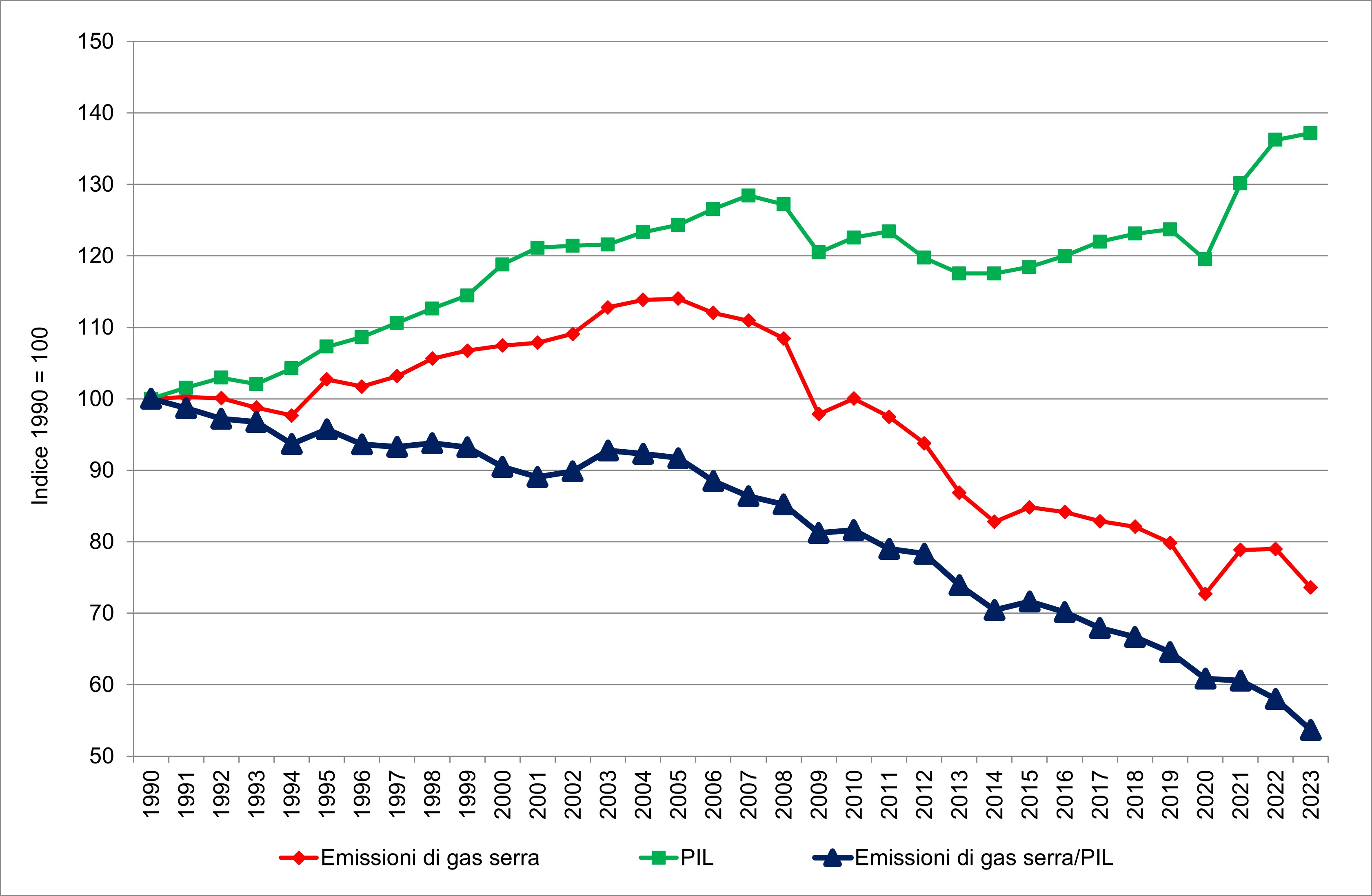 L’indicatore rappresenta l’andamento delle emissioni di gas serra in Italia per abitante dal 1990 al 2023, ottenuto rapportando i dati di emissione ufficialmente comunicati da ISPRA ai dati sulla popolazione residente al 1° gennaio pubblicati da Istat (Ricostruzione intercensuaria della popolazione) e l’andamento delle emissioni di gas serra rispetto ai dati sul Prodotto Interno Lordo ai prezzi di mercato, valori concatenati con anno di riferimento 2015, pubblicati da Istat. Gli indicatori sono rappresentati come numeri indici a base fissa (1990 = 100).