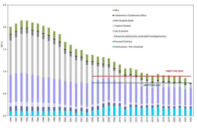 Le emissioni degli ossidi di azoto sono pari, nel 2023, a 557 kt mentre quelle dei COVNM sono pari a 871 kt. Gli ossidi di azoto raggiungono la percentuale di riduzione, imposta a partire dal 2020 dalla Direttiva 2016/2284 (-40%), già nel 2014: nel 2023, rispetto al valore del 2005, tale riduzione è pari a -57%. Anche i COVNM raggiungono l’obiettivo (-35%) già a partire dal 2020 con un decremento rispetto al 2005 del 35% confermato anche nel 2023 con il 37% (Tabella 1).