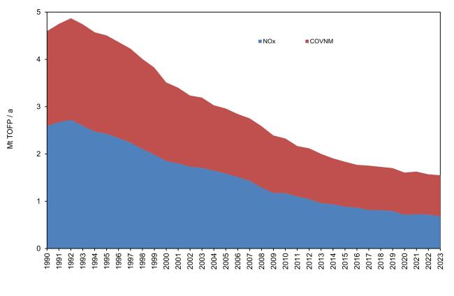 Nel periodo 1990 -2023 le emissioni dei precursori dell'ozono troposferico registrano una marcata riduzione (-74% per NOx, e -54% per COVNM), legata soprattutto alla forte diminuzione delle emissioni nei due settori dei trasporti (trasporto stradale e altre sorgenti mobili) e all’uso dei solventi (in particolare per COVNM) (Tabelle 1,2 e Figura 3).