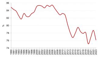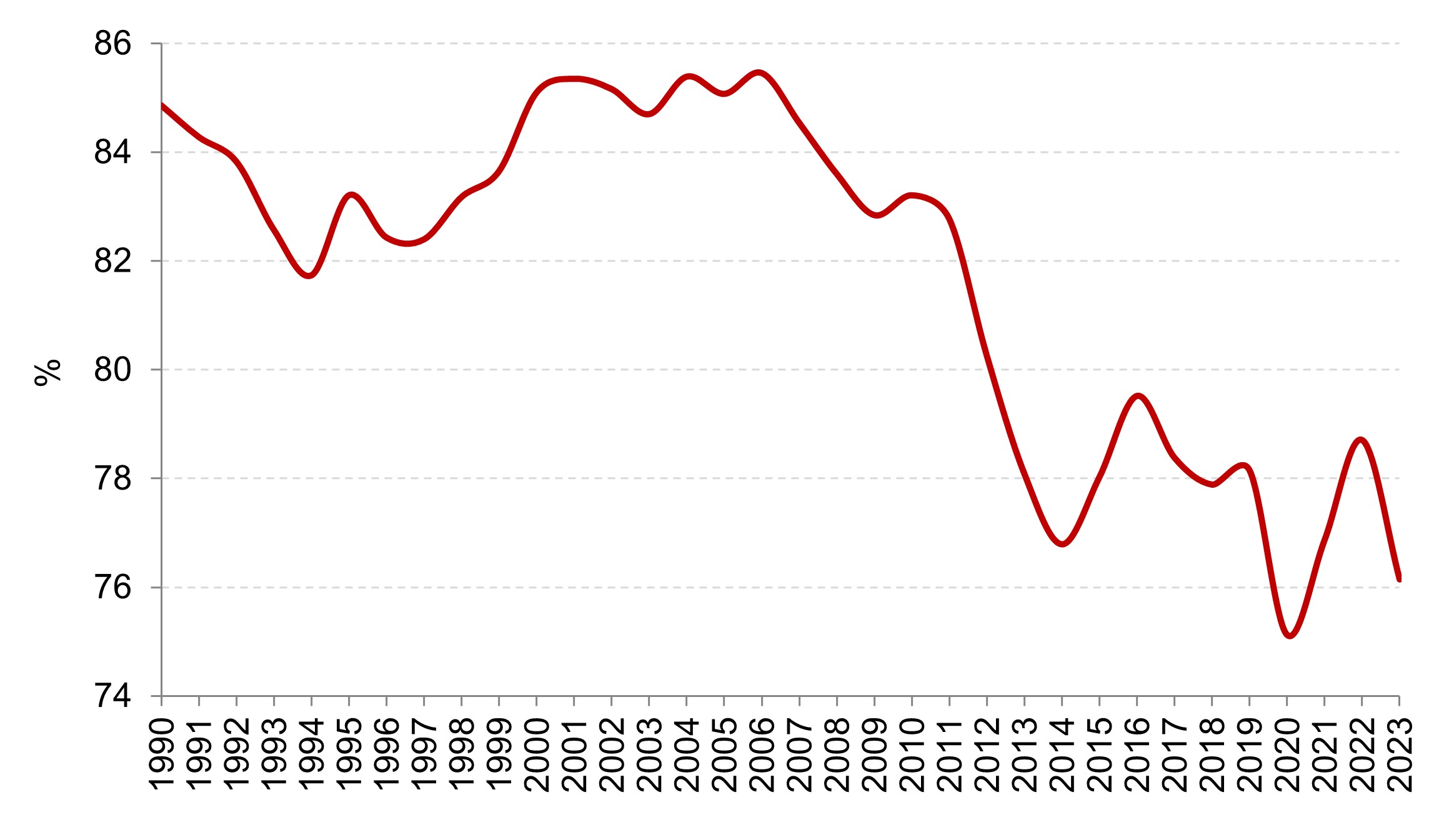 La mancanza di disponibilità di fonti energetiche interne rende l’Italia un paese a elevata dipendenza energetica. Dal 2007 si osserva una riduzione della dipendenza energetica, passata dal valore massimo registrato nel 2006 dell’85,5% al minimo del 75,1% del 2020, tornando a crescere negli anni successivi, per stabilizzarsi al 76,1% nel 2023 (Tabella 1 e Figura 1).