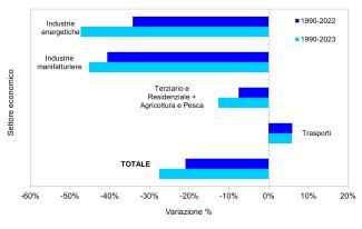 Le emissioni di gas serra da processi energetici si riducono nel 2023 del 27,5% rispetto al 1990, a ciò contribuiscono in modo determinante le industrie manifatturiere e quelle energetiche, con una contrazione pari rispettivamente a 45,2% e 47,3%. Anche il peso dei diversi settori varia e, in particolare, le emissioni di gas serra da industrie manifatturiere passano dal 21,6% nel 1990 al 16,3 % nel 2023, mentre le industrie energetiche dal 35,6% al 25,9% (Tabella 1). Le emissioni da residenziale e servizi passano, invece, da 18,5% a 22,3%, quelle dovute ai trasporti da 24,2% a 35,4% (Tabella 1).