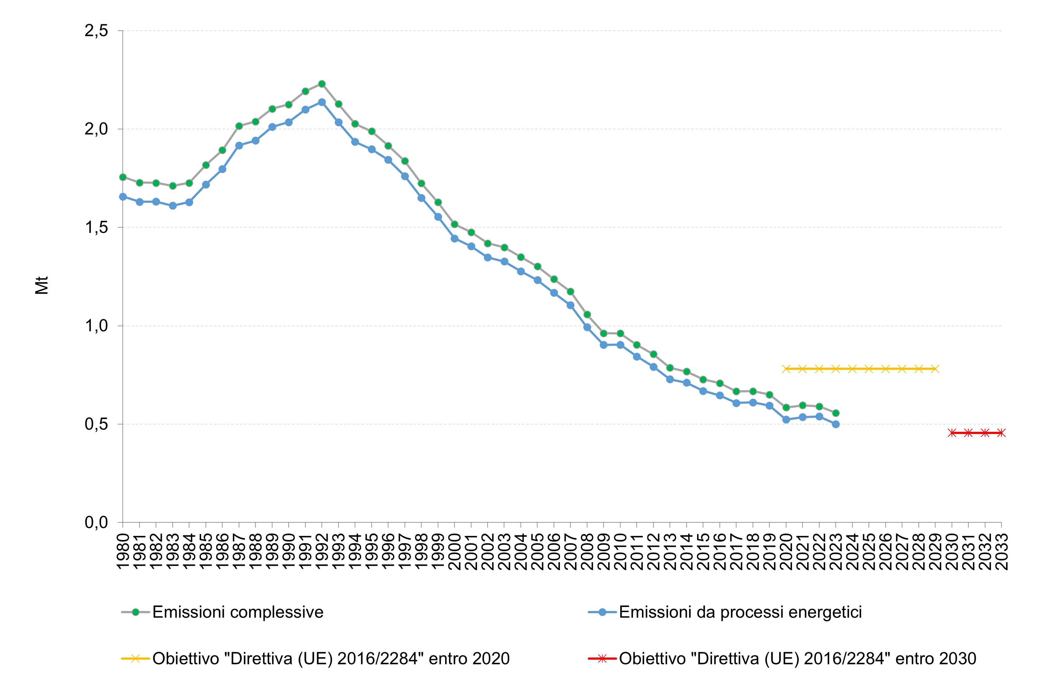 Dal 1990 si osserva la diminuzione delle emissioni di ossidi di azoto da processi energetici (-75,4,0 % nel 2023 rispetto al 1990), dovuta all’utilizzo di dispositivi per l’abbattimento delle emissioni dagli impianti stazionari e soprattutto da quelli mobili.