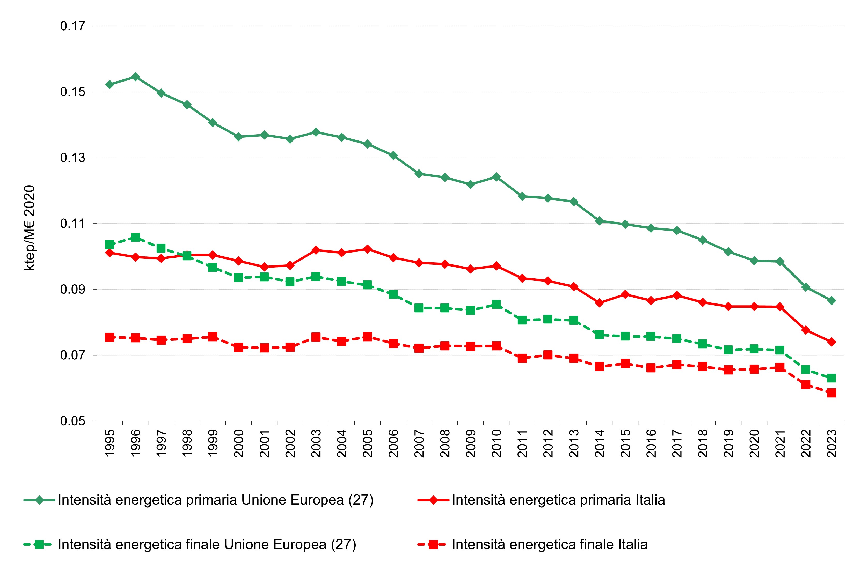 Figura 1: Intensità energetica primaria(1 - linea continua) e finale(2 - linea tratteggiata) del PIL ai prezzi di mercato a valori concatenati 2020 in EU e Italia.