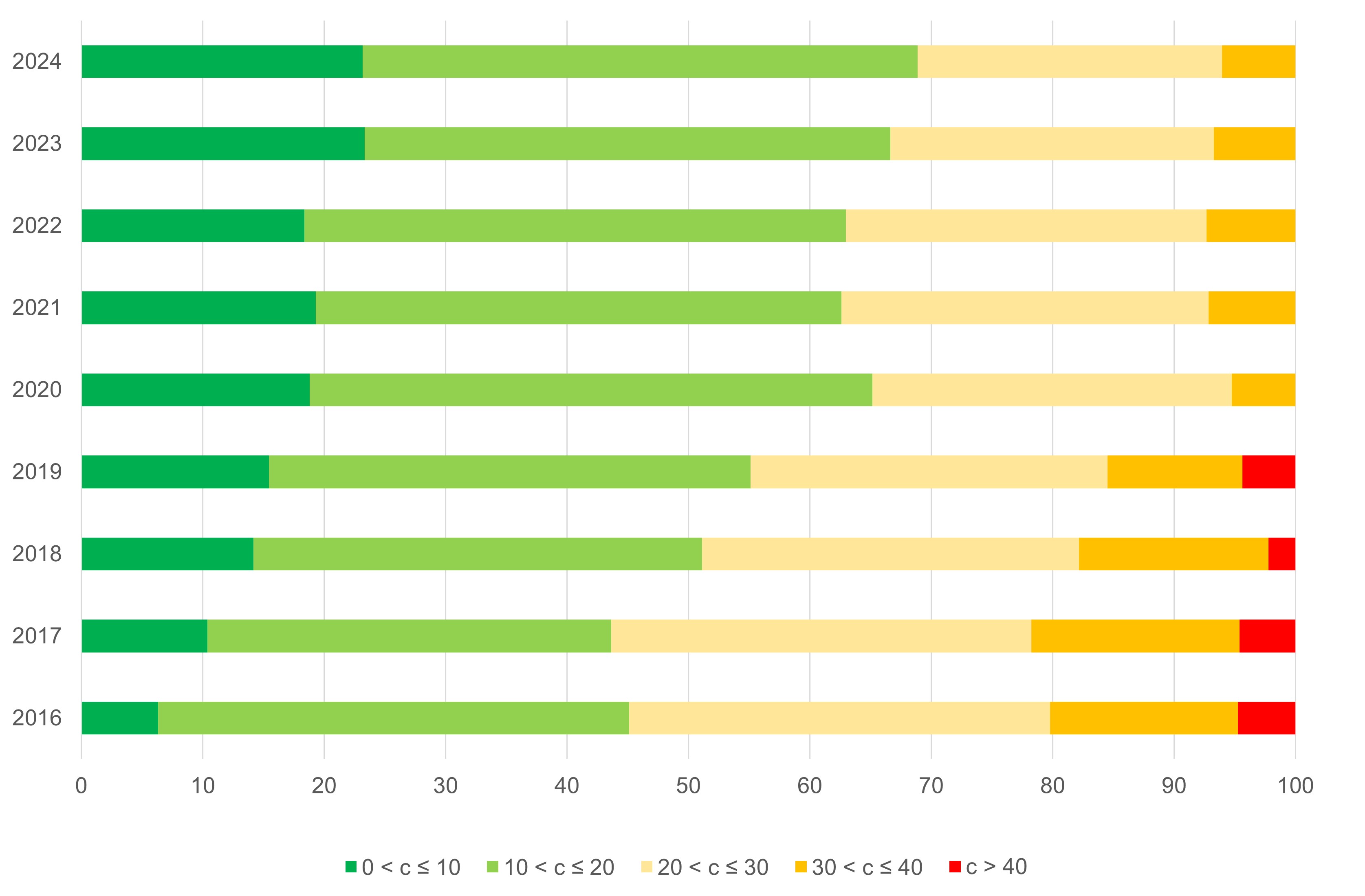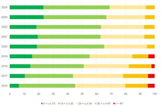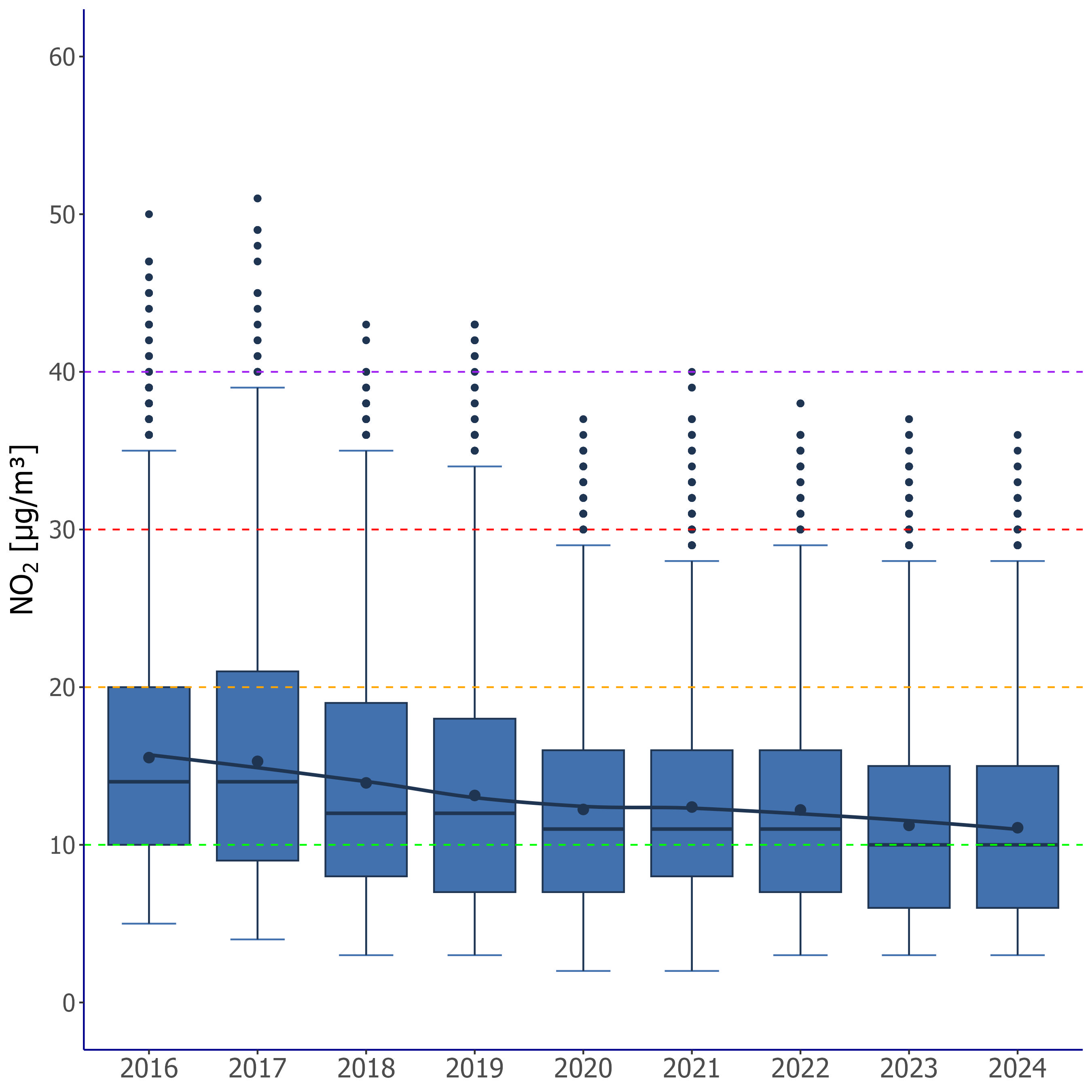 La quota di popolazione esposta a una concentrazione di NO2 inferiore al valore soglia consigliato dell’OMS cresce dal 6% del 2016 al 23% del 2024. Contestualmente la PWE anche nel 2024 come già accade dal 2020, non risulta superiore a 40 µg/m3 (nel 2016 il 5% della popolazione era ancora esposta a livelli superiori a tale soglia) (Figura 3).
