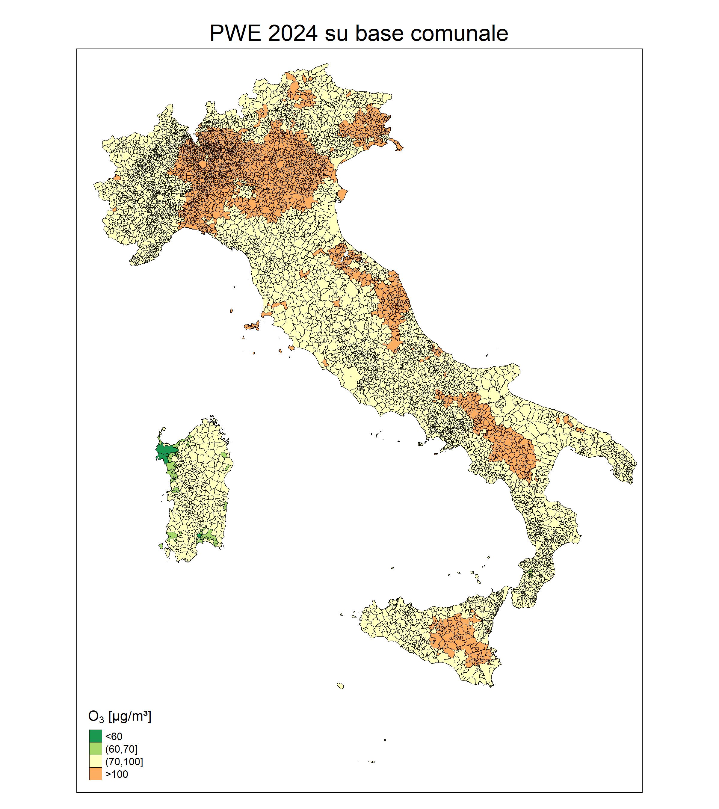 L’indicatore fornisce una stima dell’esposizione media pesata per la popolazione (Population Weighted Exposure, PWE) all’ozono (O3) nel periodo estivo, aggregata a livello comunale, permettendo il confronto della situazione tra diverse città e di avere un quadro completo dell’esposizione media a livello nazionale. Esso è rappresentativo dell’esposizione cronica della popolazione e utile per le stime di effetto sanitario a lungo termine.