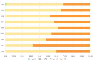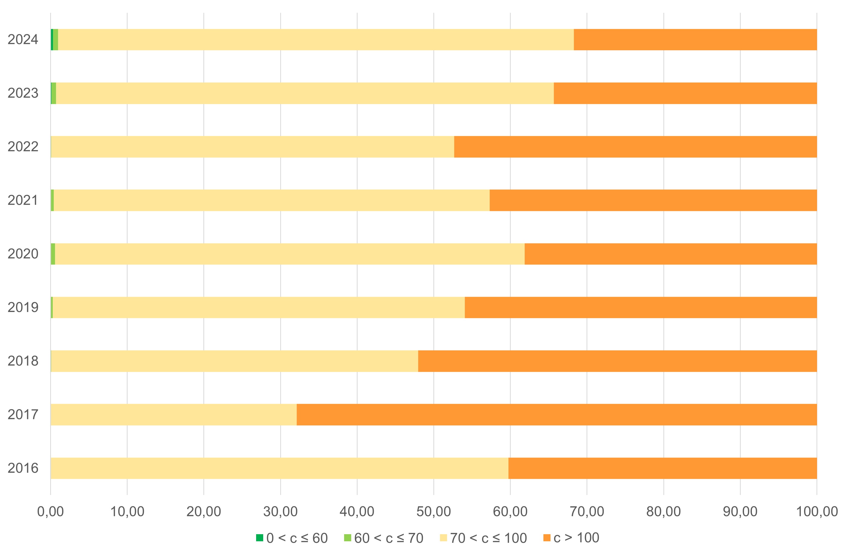 Dal 2016 al 2024, il 100% di popolazione continua a essere esposta a una concentrazione di O3 superiore al valore guida dell’OMS. Dal 2017 al 2020 si registra una riduzione nella quota di popolazione esposta a livelli superiori all’interim target 1 a favore di una maggior percentuale nei livelli compresi tra l’IT1 e l’IT2; questa riduzione si conferma anche nel 2023 e nel 2024 (Figura 3).