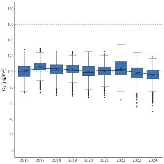 Nel 2024, il 100% della popolazione è stato esposto a livelli superiori al valore guida dell’OMS (60 µg/m3 come media della distribuzione dei massimi giornalieri delle medie mobili di 8 ore nel periodo che va da aprile a settembre).