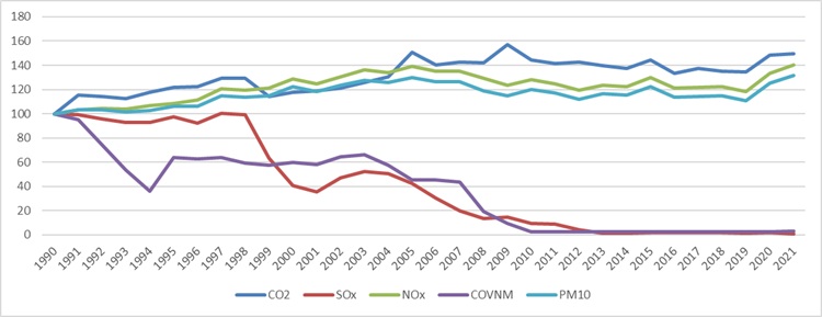 Il 2021 segna un leggero peggioramento del profilo emissivo del settore: l’intensità di CO₂ risale a circa 540 t/M€, superando il valore del 2020 di mezzo punto percentuale, e anche NOx, COVNM e PM10 mostrano piccoli incrementi (poco più del 5%). L’unica variazione favorevole riguarda gli ossidi di zolfo, la cui intensità scende nettamente a 3,6 kg/M€, quasi due terzi in meno rispetto all’anno precedente. Nel complesso, lo stato rimane medio-critico: molto buono per SOx e COVNM, adeguato per PM10 e NOx, ma ancora debole sul fronte CO₂.(Tabella 1)