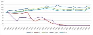 Figura 1: Intensità emissiva, indice 1990 = 100 per CO₂, SOx, NOx, COVNM, CO nell'industria cartaria