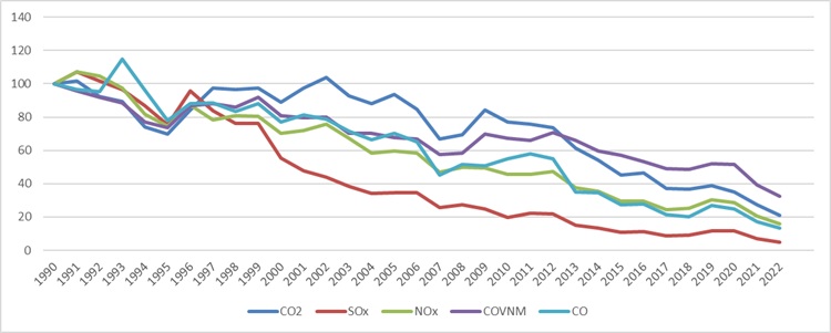 Dal 1990 l’intensità emissiva cala in misura marcata per gli SOx: -89%, mentre per gli altri inquinanti in misura inferiore: -68% CO, -61% NOx, - 50% CO2 e -22% COVNM. La riduzione più rapida per tutti gli inquinanti si ha soprattutto negli ultimi anni.
