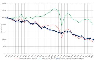 Nel complesso, dall'analisi della serie storica si evince che sia la produzione siderurgica sia le emissioni di CO2 ad essa associate decrescono: le seconde a una velocità maggiore (più che proporzionalmente) delle prime (disaccoppiamento relativo).