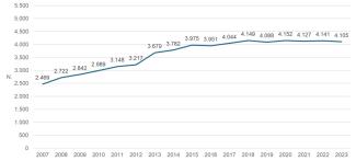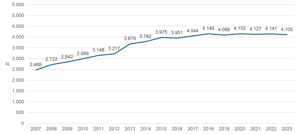 L’analisi dell’intera serie storica 2007 2023 (Figura 1) evidenzia una crescita del 66 % – da 2.466 a 4.105 stabilimenti – con un incremento medio del 3,1 % annuo fino al 2020, mantenendosi stabile nel triennio 2021 2023. Il trend rimane quindi positivo sul lungo periodo, mentre la dinamica recente conferma il raggiungimento di una soglia di saturazione.