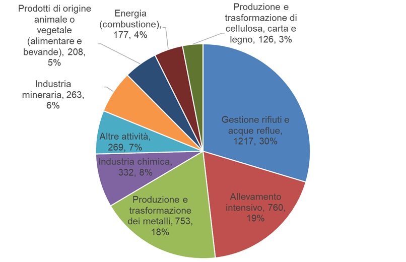 Confrontando l’ultimo anno disponibile con il precedente, gli stabilimenti dichiaranti passano da 4.111 nel 2022 a 4.105 nel 2023, una variazione minima ( 0,15 %). Il livello risulta pertanto stabile e nel complesso buono: tutte le principali categorie industriali elencate in Figura 3 sono rappresentate, salvo poche attività assenti (produzione di asbesto, acquacoltura intensiva, combustibili solidi non fumogeni) o perché non autorizzate, non presenti o perché non ricadono nell’obbligo di comunicazione al registro PRTR nazionale.