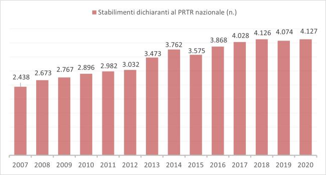Le informazioni, più recenti, sugli stabilimenti e sulle attività PRTR sono state raccolte con la Dichiarazione PRTR 2020 e sono quindi riferite al 2020. Con riferimento al 2020 la base di dati del registro PRTR è costituita dalle informazioni fornite da oltre 4.000 stabilimenti: il numero di stabilimenti dichiaranti è sempre cresciuto negli anni passando dai 2.438 del 2007 ai 4.127 del 2020 (Figura 1). L'aumento del numero di dichiarazioni nel tempo può essere ascrivibile alla consapevolezza sempre maggiore di questo adempimento di legge tra i soggetti potenzialmente obbligati, derivante anche dalle azioni di sensibilizzazione e diffusione delle informazioni intraprese dall'ISPRA con le Associazioni di categoria e con le Autorità competenti locali. Il numero di attività PRTR dichiarate è pari, nel 2020, a 5.086: anche per queste si evidenzia un continuo incremento a partire dalle 2.469 dichiarate per il 2007 (Tabella 2). In generale il numero di attività PRTR totali risulta sempre maggiore del numero di dichiarazioni pervenute, in quanto in uno stesso stabilimento dichiarante possono essere svolte una o più attività PRTR.