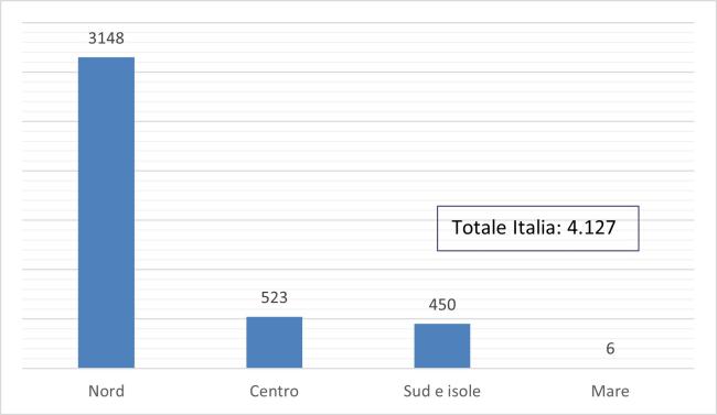 I cicli annuali di raccolta delle informazioni relative al registro INES hanno permesso, in passato, di costruire una base dati relativa a oltre 700 stabilimenti con riferimento agli anni dal 2002 al 2006. L'evoluzione della normativa europea e nazionale e l'istituzione del registro nazionale PRTR hanno ampliato il numero degli stabilimenti soggetti all’obbligo della dichiarazione PRTR e quindi la base dei dati disponibili. Nel 2020 il numero degli stabilimenti dichiaranti è pari a 4.127 (Tabella 1). Rispetto alle attività svolte dai complessi produttivi si nota che, nel corso degli anni, solo alcune delle 45 categorie PRTR non risultano coperte dai dati del Registro, e, in particolare, le seguenti: • impianti per la fabbricazione dei prodotti a base di carbone e di combustibili solidi non fumogeni; • impianti per la produzione dell'asbesto e per la fabbricazione di prodotti a base di asbesto; • impianti per l'acquacoltura intensiva; • impianti per la costruzione, la verniciatura o sverniciatura delle navi (cantieri navali). Le operazioni di valutazione della qualità dei dati dichiarati e la maggiore diffusione della conoscenza di questo obbligo di legge hanno comportato, oltre a un miglioramento della qualità dei dati comunicati, anche un ulteriore ampliamento della base dichiarante per il Registro PRTR. Nel 2020 le attività PRTR non coperte dal registro corrispondono a quelle elencate in precedenza ad eccezione dall'attività dei cantieri navali dichiarata da uno stabilimento. Riguardo alla produzione di asbesto, in virtù del quadro normativo nazionale di riferimento, non ci si aspetta che esistano stabilimenti industriali italiani che svolgano questa attività. A livello di macroarea geografica, gli stabilimenti dichiaranti PRTR sono 3.148 al Nord, 523 al Centro, 450 al Sud e Isole e 6 in mare (Tabella 1 e Figura 2), mentre, riguardo alla tipologia di attività PRTR, gli stessi sono principalmente distribuiti per il 28% nella gestione dei rifiuti e delle acque reflue (1.144), per il 18% nell'industria dei metalli (747), per il 22% nell'allevamento intensivo (896) e per l'8% nell'industria chimica (329) (Tabella 2 e Figura 3).
