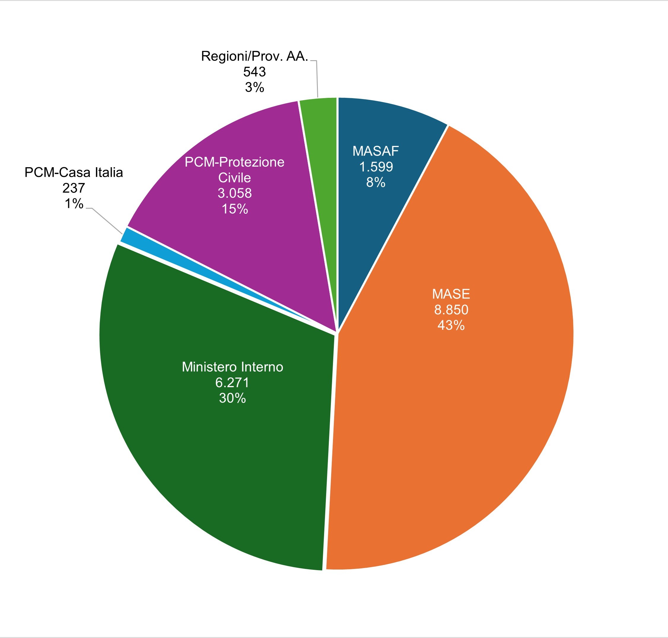 In particolare, gli interventi extra-MASE, finanziati da Ministero dell’Interno, Dipartimento Protezione Civile, Dipartimento Casa Italia, MASAF e Regioni Calabria e Lombardia, rappresentano in numero oltre il 73% (18.938) del totale, cui corrisponde un finanziamento di quasi il 57% (11.708 Mln €).