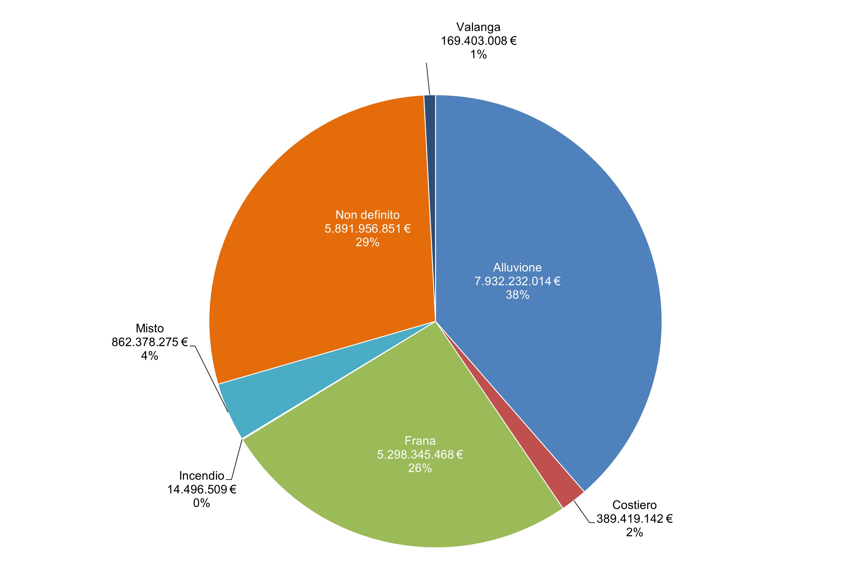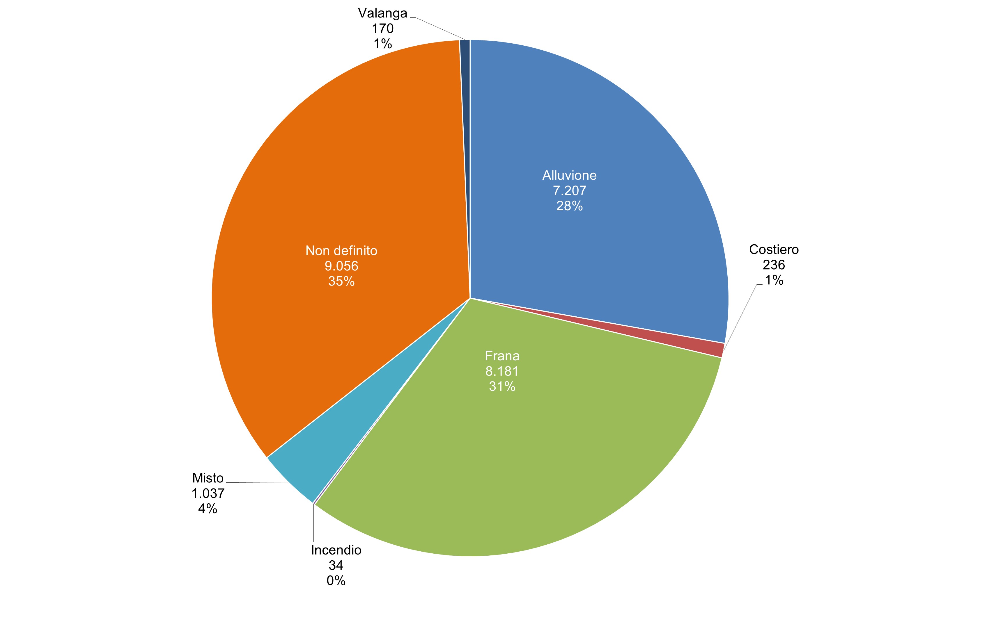 Una criticità che emerge chiaramente dall’analisi delle Figure 3a e 3b è il dato relativo all’elevato numero di interventi (9.056) per i quali non è stata definita la tipologia di dissesto in riferimento al quale tali interventi sono stati finanziati che, da soli, rappresentano circa il 35% del totale degli interventi considerati. Quanto sopra risulta ancora più critico se si considera che a tali interventi sono associate risorse pari al 29% di quelle complessivamente stanziate, per un importo corrispondente di quasi 5.892 Mln €.
