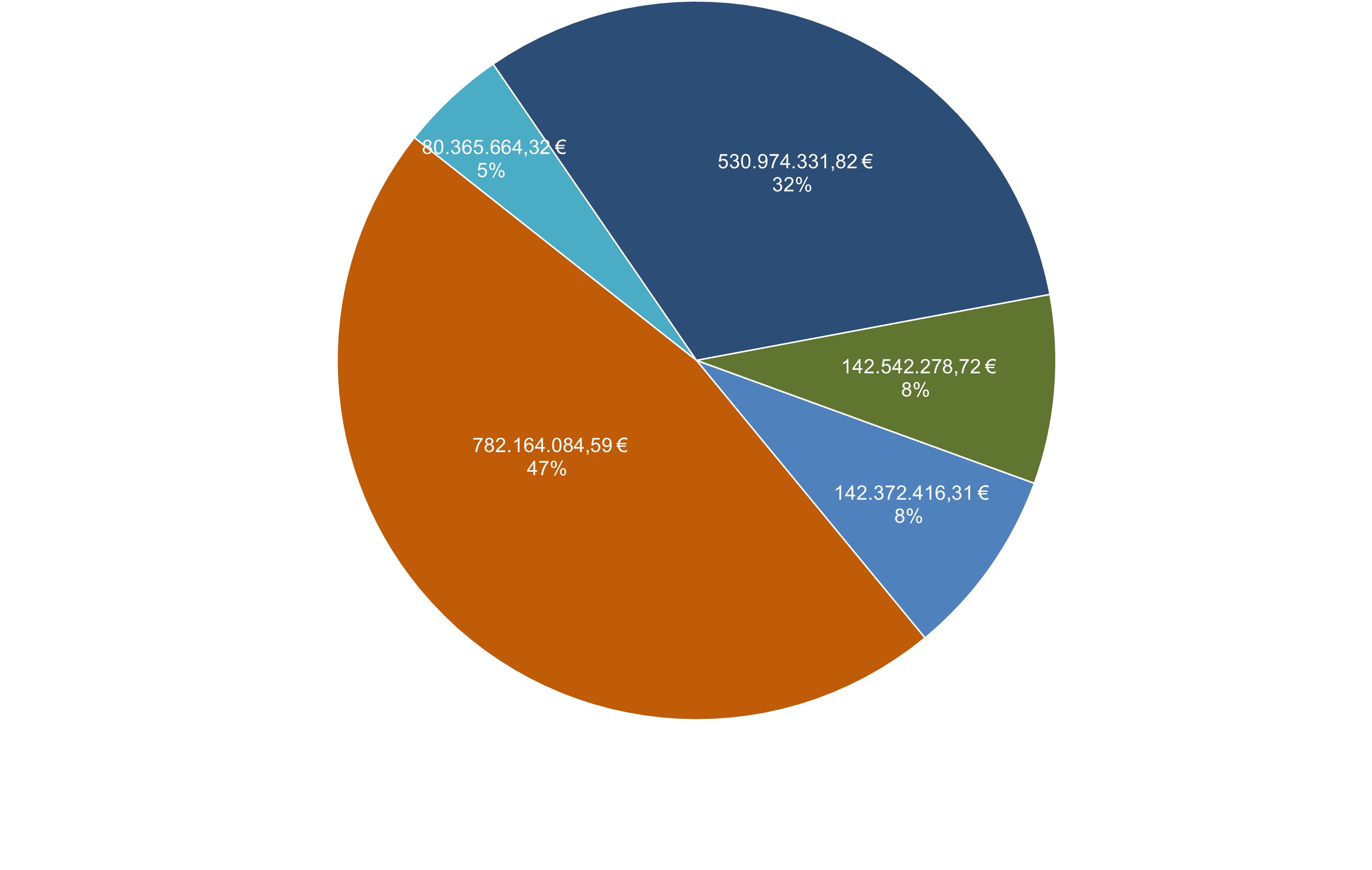 Figura 2a. Distribuzione degli importi complessivi degli interventi finanziati, suddivisi per Competenza (cfr. Tabella 1) delle diverse Amministrazioni che erogano le risorse per la realizzazione degli interventi censiti in ReNDiS (dal 1999 al 31 dicembre 2024).