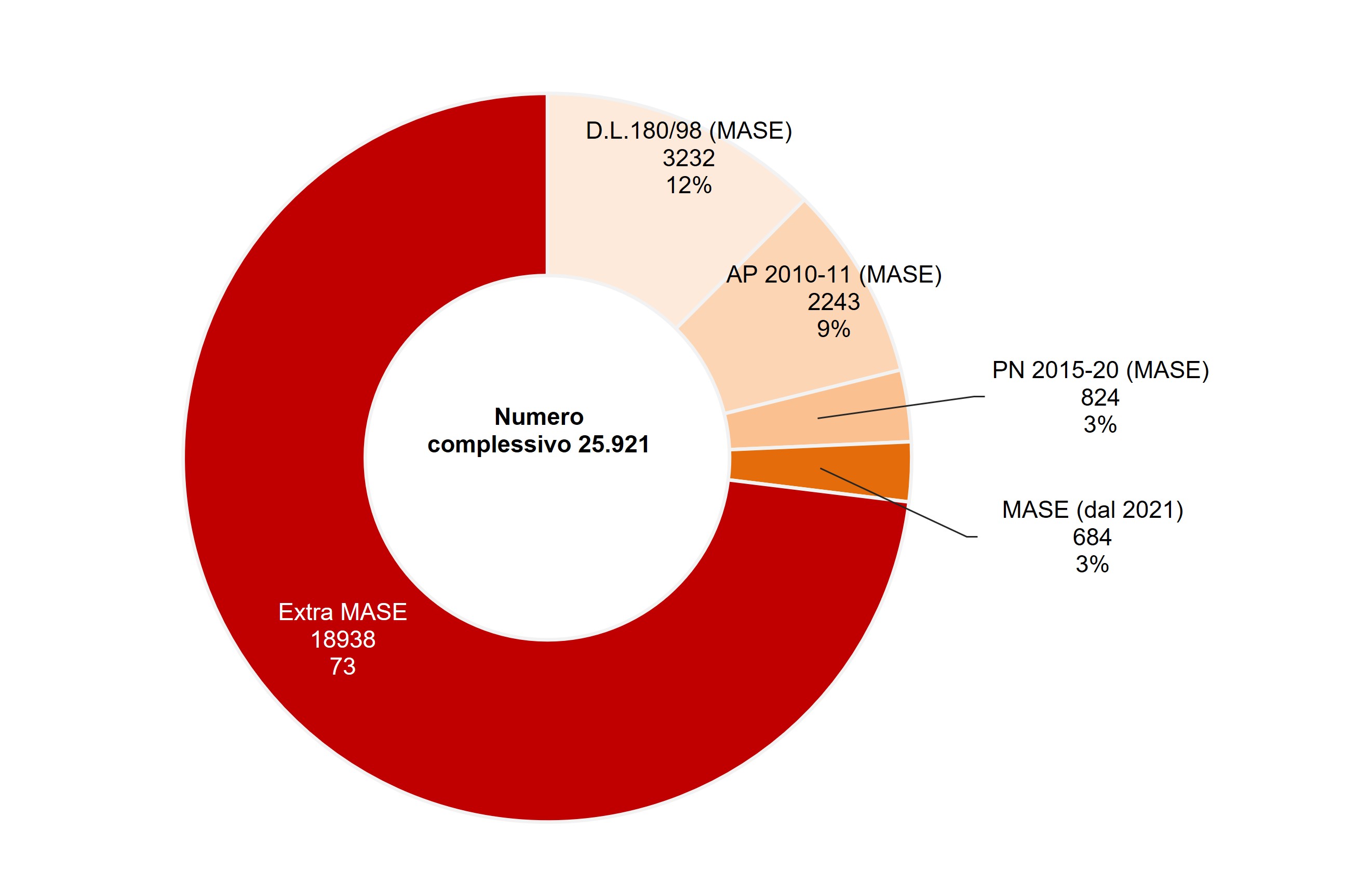 Figura 1a. Distribuzione complessiva del numero d’interventi suddivisi per gruppo di finanziamento presente in ReNDiS (cfr. Tabella 1) finanziati dal MASE e con altre fonti di finanziamento pubblico (extra MASE) (dal 1999 al 31 dicembre 2024).