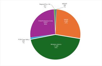 Di questi, il numero degli interventi di competenza MASE risulta essere quasi il 30% (6.983) del totale, cui corrisponde il relativo finanziamento che è pari a circa il 43% (8.850 Mln €) rispetto alle risorse complessivamente stanziate dalle diverse Amministrazioni pubbliche finanziatrici degli interventi censiti in ReNDiS.