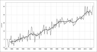 Il livello medio mare relativo è in tendenziale aumento a Venezia sin dall'inizio delle rilevazioni (1872). Nel corso dell’intero periodo la curva non ha però mostrato sempre una pendenza positiva costante (Figura 1). Sono infatti evidenti fasi caratterizzate da relativa stabilità o addirittura controtendenza (approssimativamente tra il 1915 e il 1925 e tra il 1965 e il 1995), e altre invece in cui si rileva un forte incremento (tra gli anni ’30 e ’60 e il periodo che va da metà anni ’90 ai giorni nostri). Il livello medio mare risulta molto elevato dal 2009, tanto che gli ultimi 16 anni della serie storica sono i più alti di sempre.