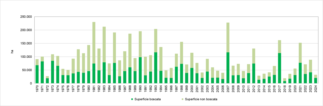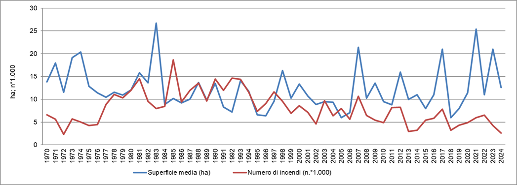 Il fenomeno degli incendi, analizzato sulla base dei dati raccolti dal 1970 al 2024 dal CUFA dell'Arma dei Carabinieri (ex Corpo Forestale dello Stato) presenta un andamento altalenante, con anni di picco (1993, 2007, 2017, 2021) che si alternano ad anni di attenuazione (2013, 2014, 2018, 2024). La presenza degli incendi all’interno delle Aree Protette (registrata a partire dal 2003), pur mostrando oscillazioni annuali, rimane elevata, con una media negli ultimi tre anni di 11.000 ettari percorsi dal fuoco. Molto alta l’incidenza degli incendi di origine volontaria, che rappresentano circa la metà degli eventi registrati, arrivando in alcuni anni a superare il 60%.