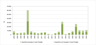 Il trend non è definibile in quanto l'esame complessivo dei dati mostra un andamento altalenante del fenomeno degli incendi, con anni di picco e successive attenuazioni (Tabella 1, Figure 1a e 2). Si può osservare un periodo notevolmente critico negli anni `80 e ’90 in cui il livello del fenomeno si è mantenuto sempre complessivamente elevato, mentre a partire dagli anni 2000 si è avuta nell’insieme una progressiva mitigazione, interrotta però da alcuni anni di maggior impatto, come il 2007, il 2012 e il 2017. Successivamente il 2018 ha segnato un’attenuazione del fenomeno che ha ripreso a crescere a partire dal 2019 fino al 2021 (Figura 1a), anno di picco in cui nel nostro Paese sono stati percorsi da incendio 151.964 ettari. Nel 2024 si è registrata un’attenuazione del fenomeno complessivo (Figura 1a), ma non all’interno delle Aree Protette (Figura 1b).