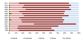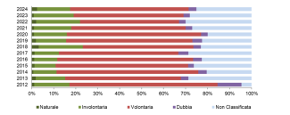 I dati relativi alle cause (disponibili dal 1998 e riferiti alle sole regioni a statuto ordinario) confermano l'origine volontaria della maggior parte degli incendi (Figure 3a e 3b). Gli eventi di origine volontaria rappresentano oltre la metà di quelli totali registrati, arrivando a superare il 60%in alcuni anni (2012, 2014, 2015, 2016, 2020) (Figura 3b), nel 2024 è stato di origine volontaria il 53,9% degli incendi. Tali dati suggeriscono la necessità di una sempre più rigorosa applicazione degli strumenti repressivi affiancati a quelli preventivi.