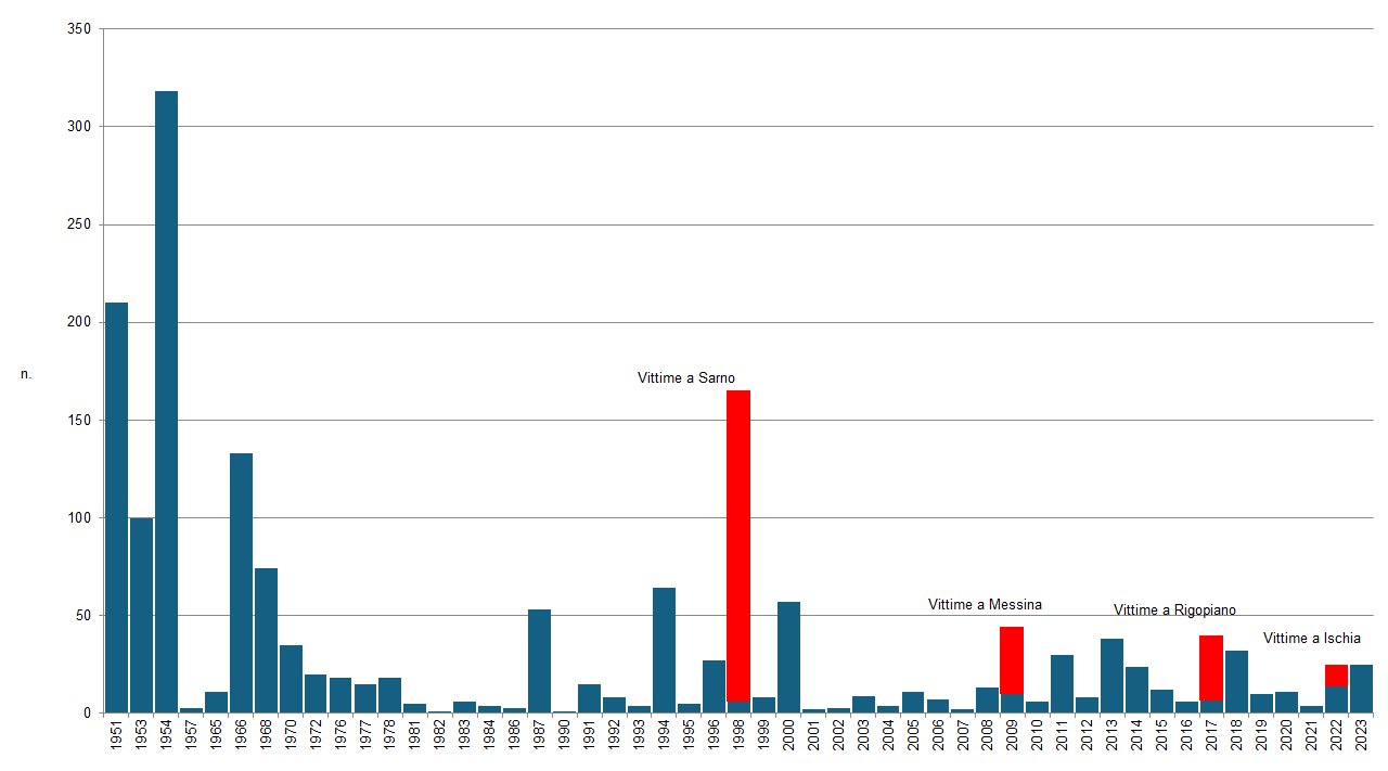 Dopo aver raccolto e rappresentato nelle varie tabelle i dati relativi ai caratteri generali degli eventi, in una successiva fase, per ogni singolo anno è stata calcolata la somma delle vittime ed effettuata una stima dei danni prodotti dagli eventi a scala nazionale. Al fine di renderli confrontabili per anni differenti e fornire un riferimento rispetto all'economia nazionale, i danni sono stati rapportati al valore del PIL (su base ISTAT) dell'anno in cui gli eventi si sono verificati. Si evidenzia che, per il calcolo danno/PIL, nei casi in cui non è stato possibile reperire informazioni in merito alla stima dei danni, viene riportata la cifra riferita ai fondi stanziati.